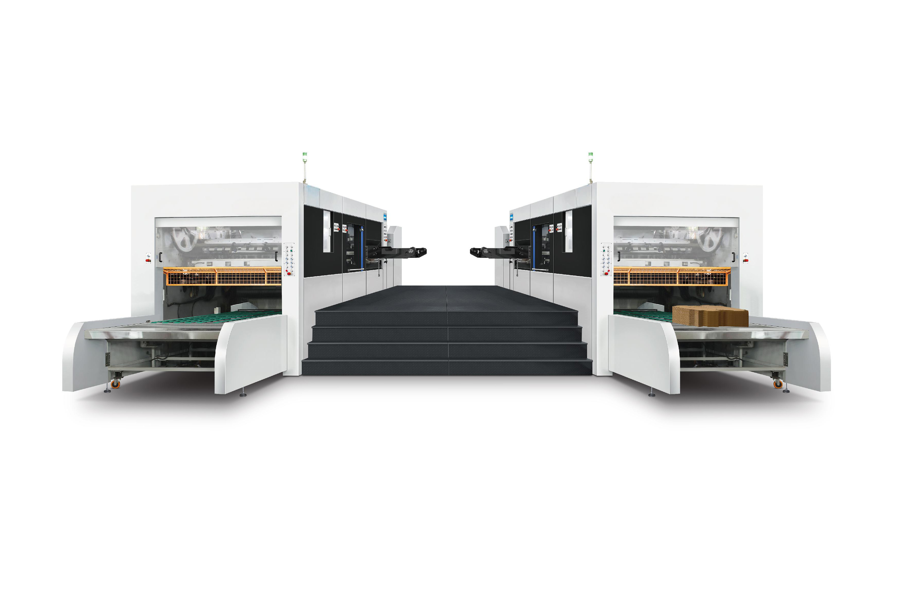 - Operação Dupla: Duas máquinas de corte de matriz plana operam simultaneamente com alimentação e coleta sincronizadas