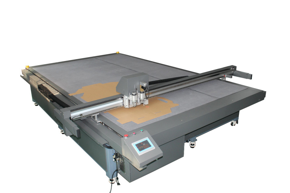 This high-speed flatbed digital cutting machine is equipped with multiple tools including vibrating knife, creasing wheel, drag knife, V-cut knife, and pen. It handles various materials such as PP sheets, corrugated paper, honeycomb board, card paper, foam, grey board, KT board, PVC expansion sheet, and other materials commonly used in advertising and display industries.
